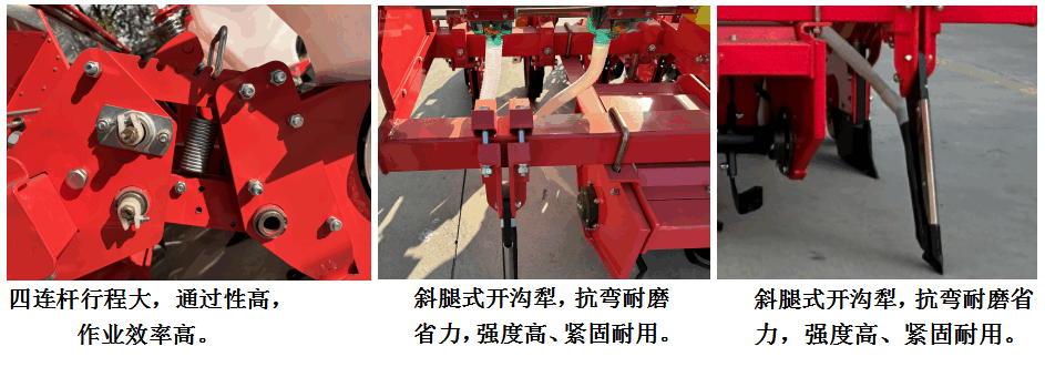 6、地輪采用單臂設計,有效避免纏繞、擁堵,各行傳動軸連成一體,統一驅動,傳動動力大,即使其中一側地輪偶然打滑也不影響正常播種:播種單體采用仿形設計,可隨地面上下浮動、可實現播深一致。