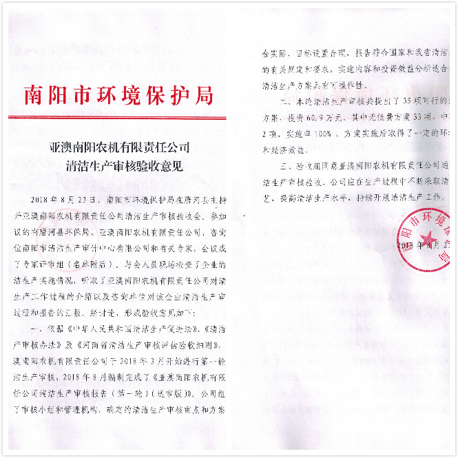 8月23日南陽市清潔生產(chǎn)審計(jì)中心攜權(quán)威認(rèn)證專家對我公司清潔生產(chǎn)情況進(jìn)行審核,會議上,專家對我公司清潔生產(chǎn)情況給予高度評價(jià),一致認(rèn)定亞澳農(nóng)機(jī)通過清潔生產(chǎn)審核,同時(shí)也為公司后續(xù)清潔生產(chǎn)提出一定要求及需改進(jìn)的地方。我公司副總表示,接受專家們的建議,后續(xù)公司在清潔生產(chǎn)方面也將不斷改進(jìn)。
