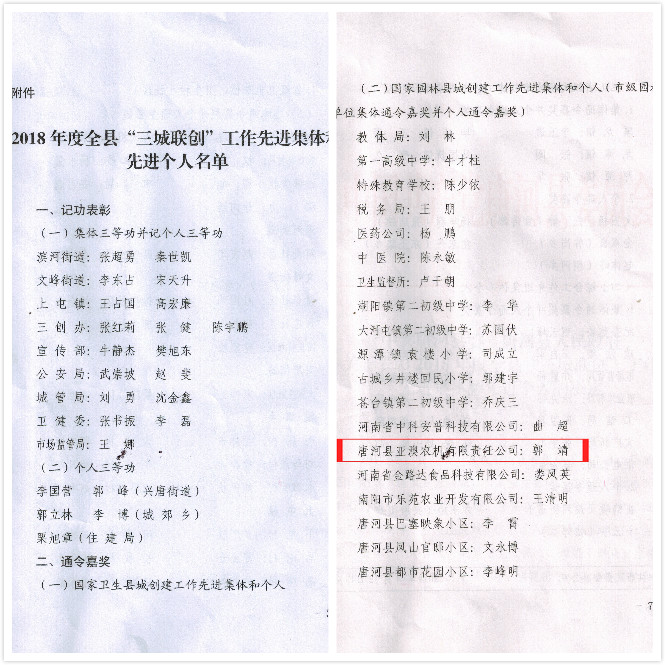 4月12日,唐河縣召開2018年度“三城聯(lián)創(chuàng)”總結(jié)大會(huì)。大會(huì)宣讀了表彰先進(jìn)集體及先進(jìn)個(gè)人的決定。亞澳農(nóng)機(jī)獲得2018年度國家園林縣城創(chuàng)建工作先進(jìn)集體。