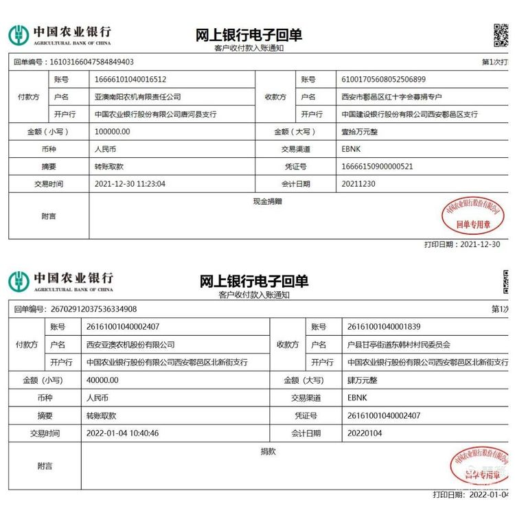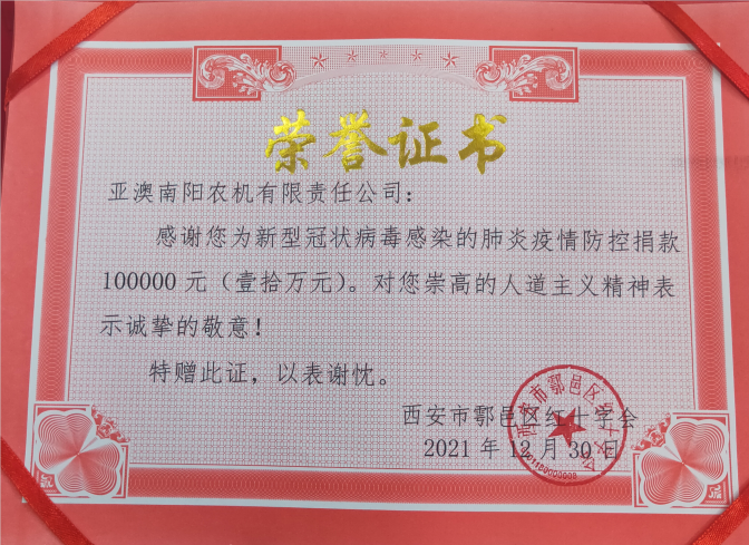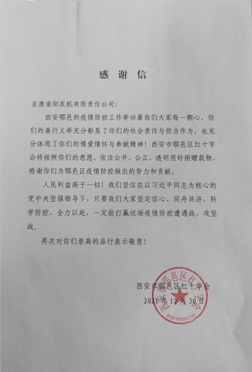 十二月份,一場突如其來的疫情打亂了西安人平靜的生活,面對日趨嚴峻的疫情態勢,亞澳農機作為一家有社會責任感的企業積極奉獻自己力量,亞澳農機南陽公司為鄠邑區紅十字會捐款100000元,亞澳農機總公司為鄠邑區甘亭街道東韓村捐款40000元,亞澳農機與社會各界人士并肩作戰,為疫情防控工作貢獻自己的一份薄力。